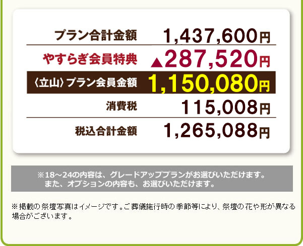 | 1 | 立山 生花祭壇 | 18 | やすらぎプラン 棺 A-11 |